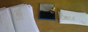 Stempel aufs Kissen, zwei Umschläge abstempeln, Umschläge wegschieben und wieder von vorn; *Flumpf* – Pomm! Pomm! – *Raschel*, *Flumpf* – Pomm! Pomm! – *Raschel* – immer wieder, herrlich meditativ.